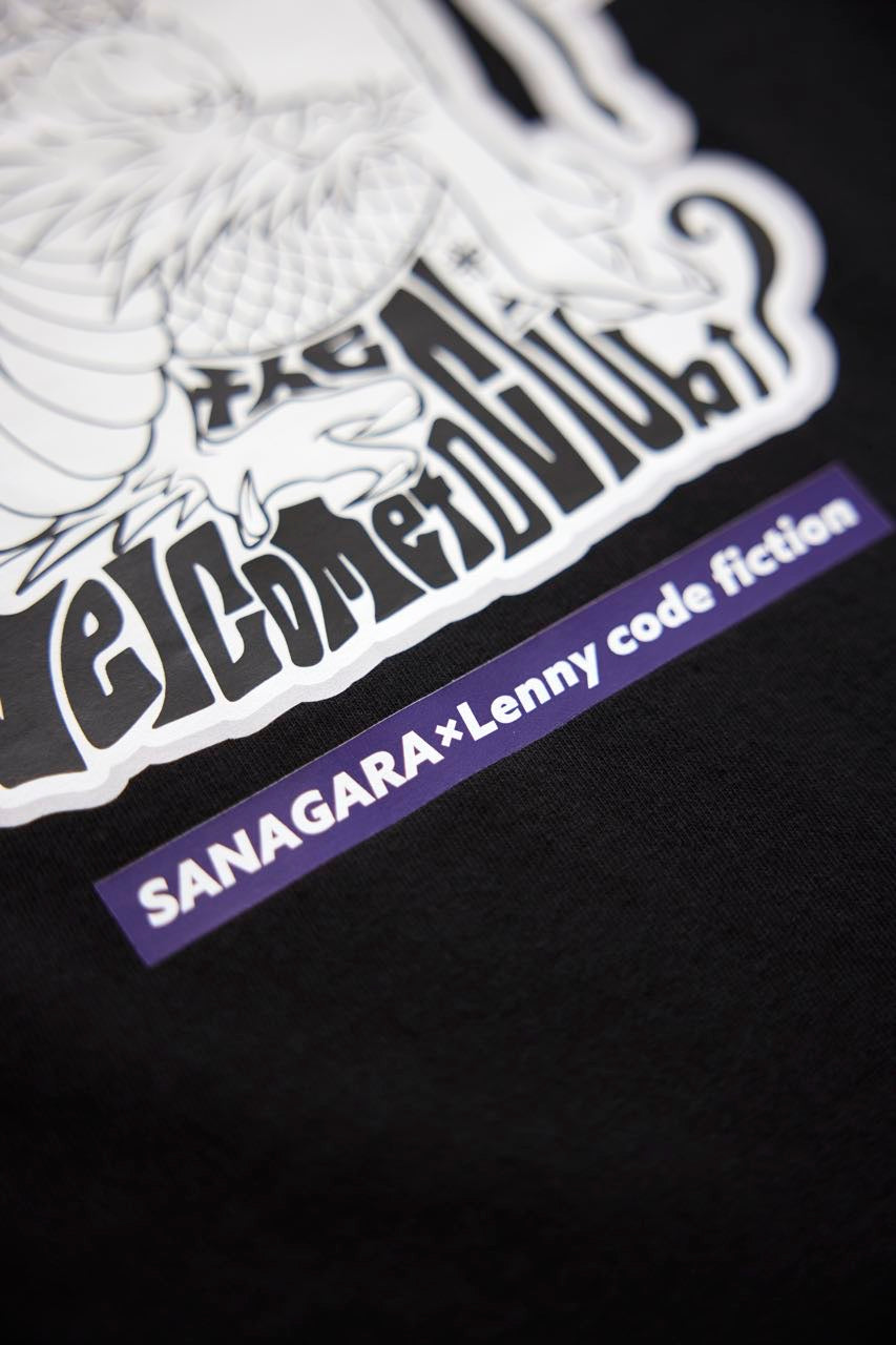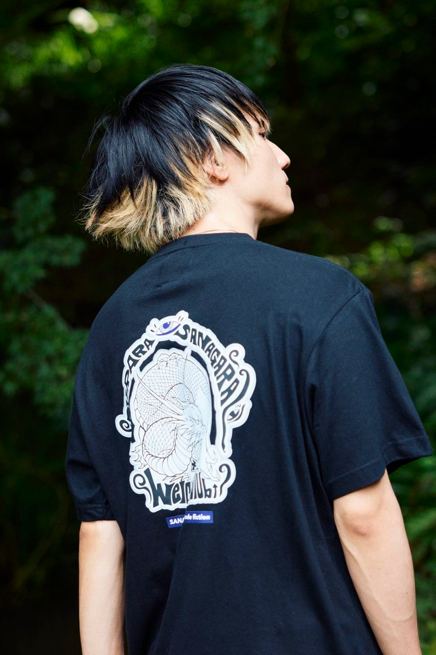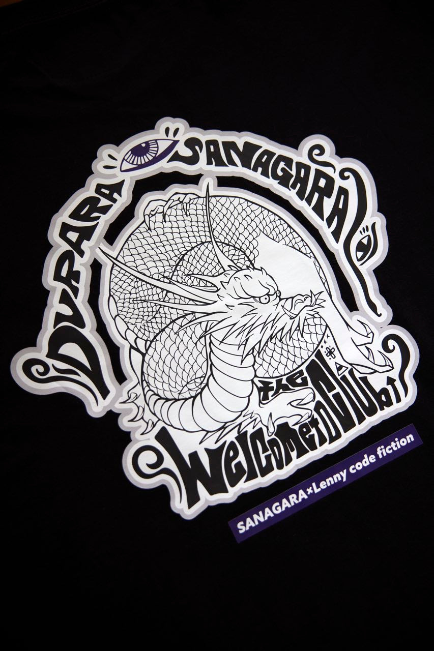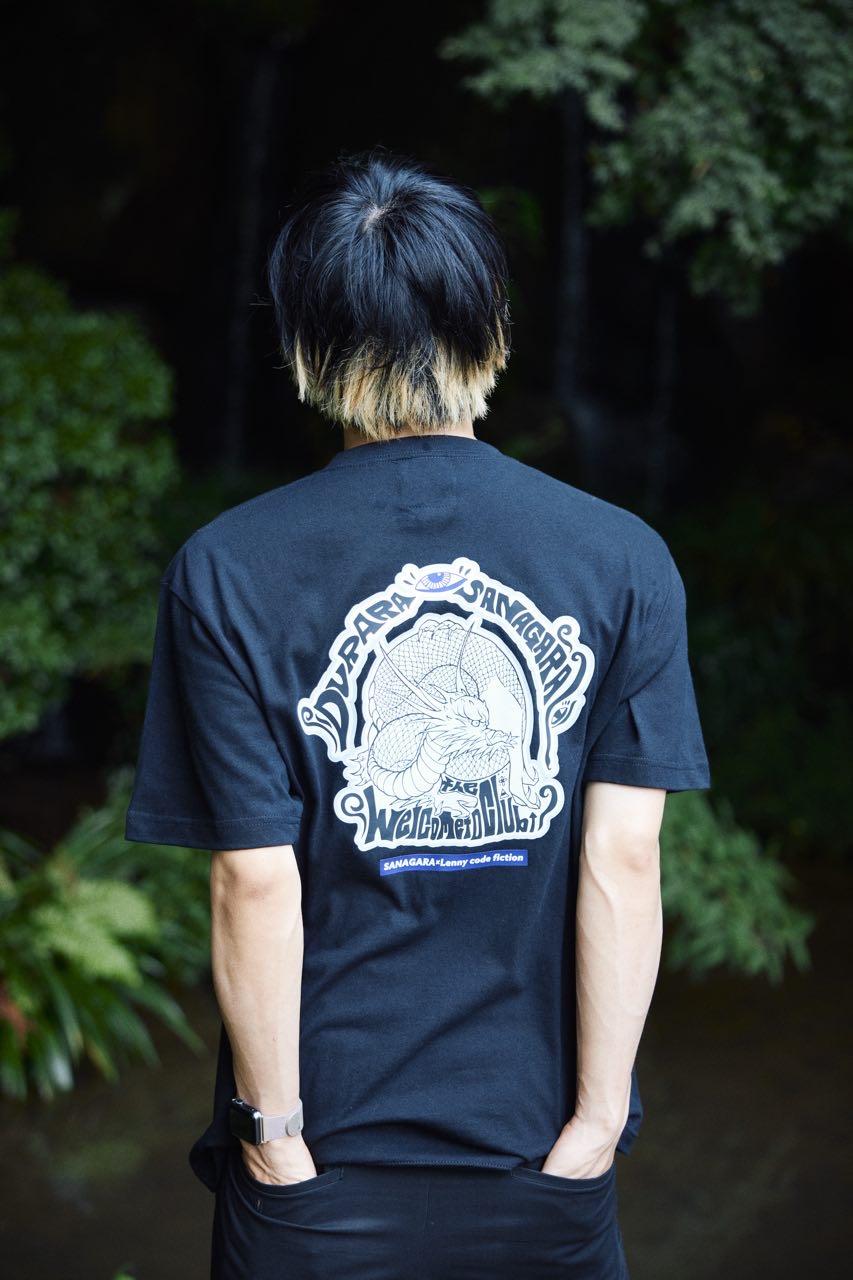 片桐 航を中心に滋賀で結成された4人組ロックバンド「Lenny code fiction」とのコラボデザインTシャツ。2023.9.2に開催したSANAGARA APPAREL pre.秋宴「LOVE AND PSYCHEDELIC」vol.1への出演を記念して制作。vo.>.の航とRyohey(All Good Soldiers)の初共作デザイン。古来より神様として崇められる龍。水や縁にまつわる神様でもあり、リュウ=流として血や氣、時代の流れを良くし更なる上昇を願う意味も込めてデザイン。SNAGARA式龍神思想武装服。