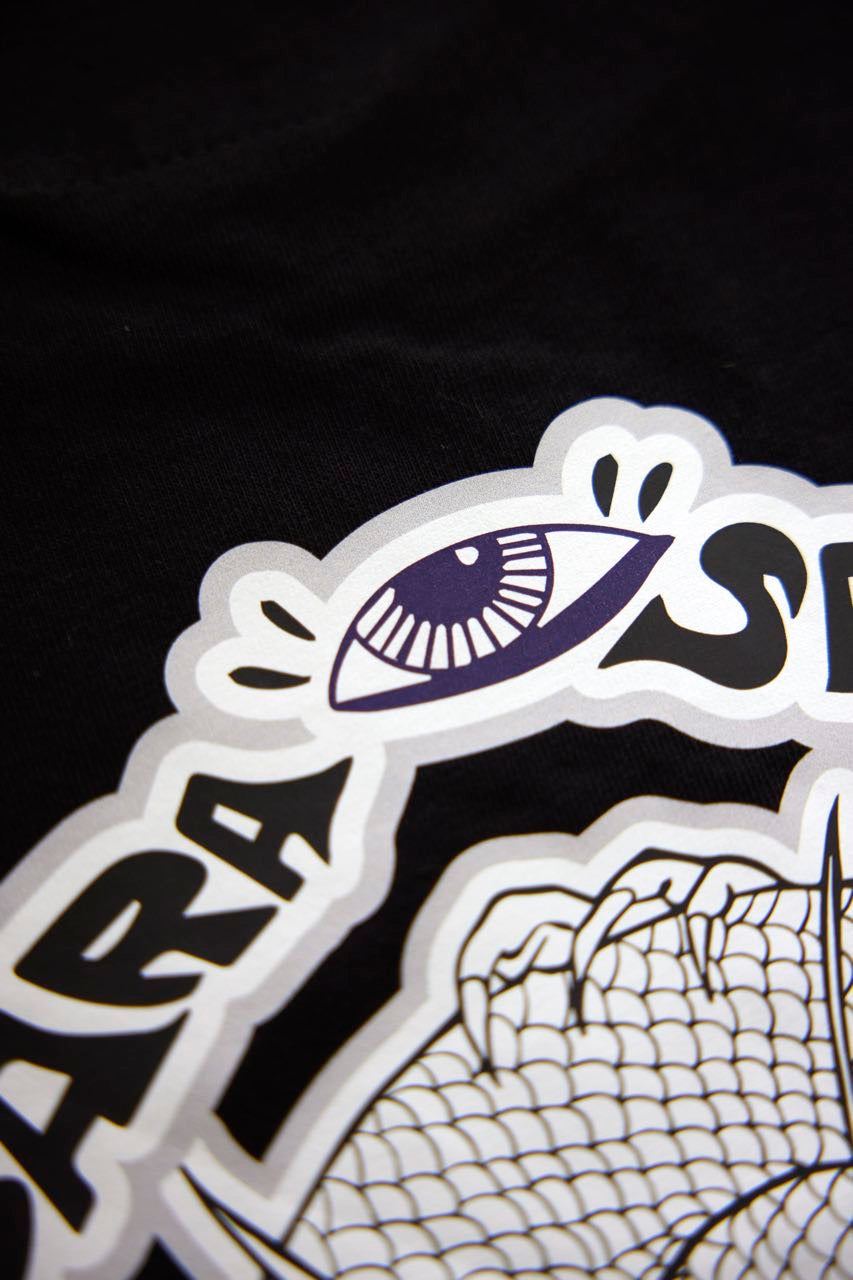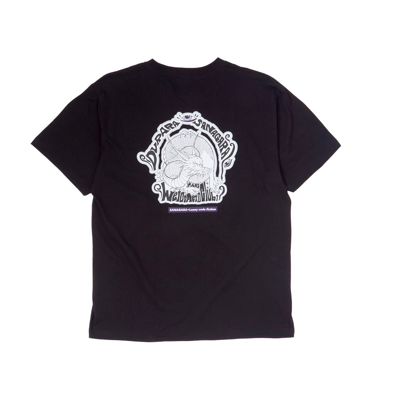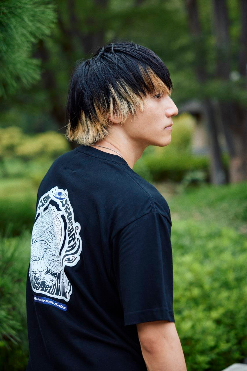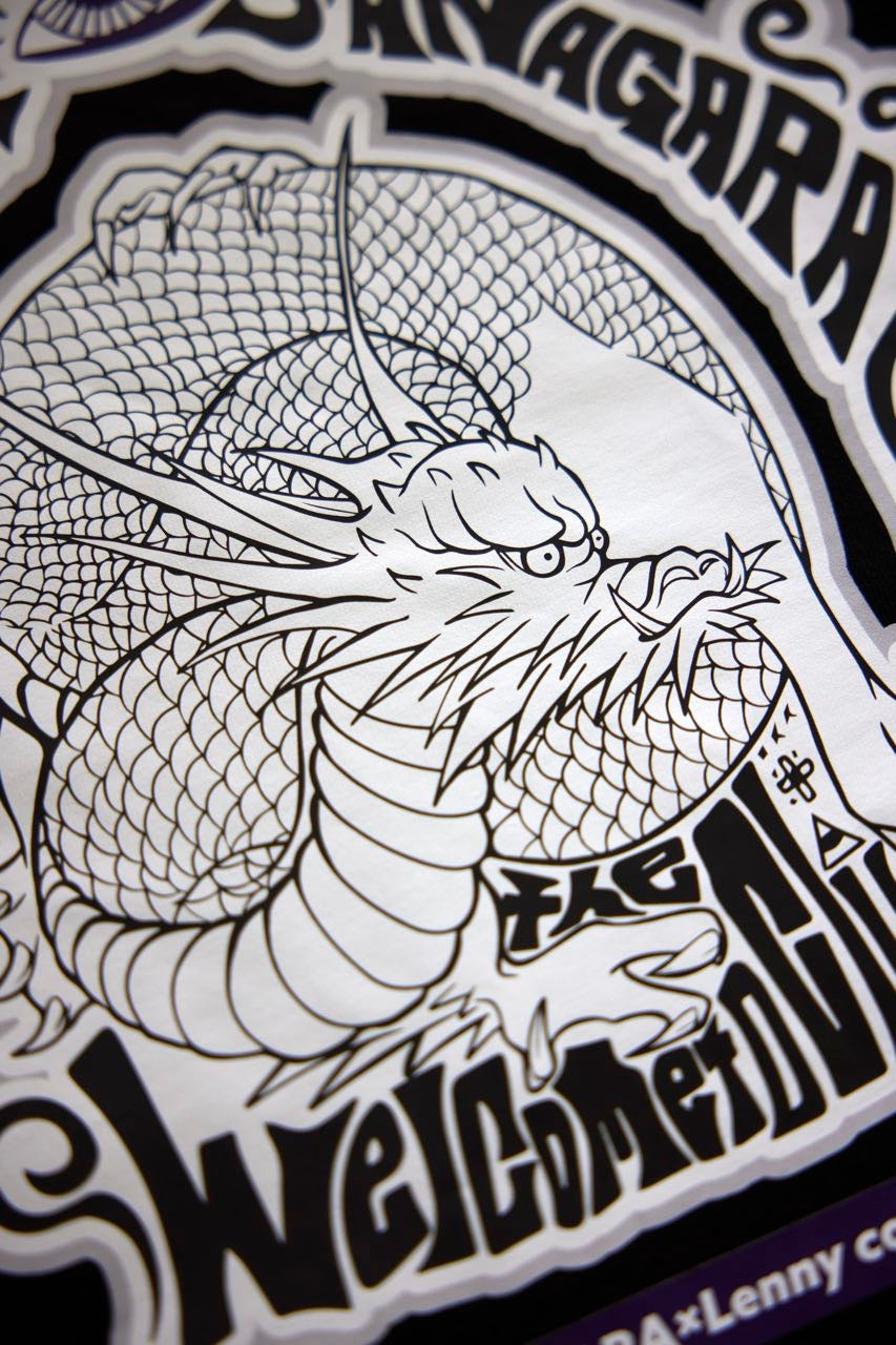 片桐 航を中心に滋賀で結成された4人組ロックバンド「Lenny code fiction」とのコラボデザインTシャツ。2023.9.2に開催したSANAGARA APPAREL pre.秋宴「LOVE AND PSYCHEDELIC」vol.1への出演を記念して制作。vo.>.の航とRyohey(All Good Soldiers)の初共作デザイン。古来より神様として崇められる龍。水や縁にまつわる神様でもあり、リュウ=流として血や氣、時代の流れを良くし更なる上昇を願う意味も込めてデザイン。SNAGARA式龍神思想武装服。