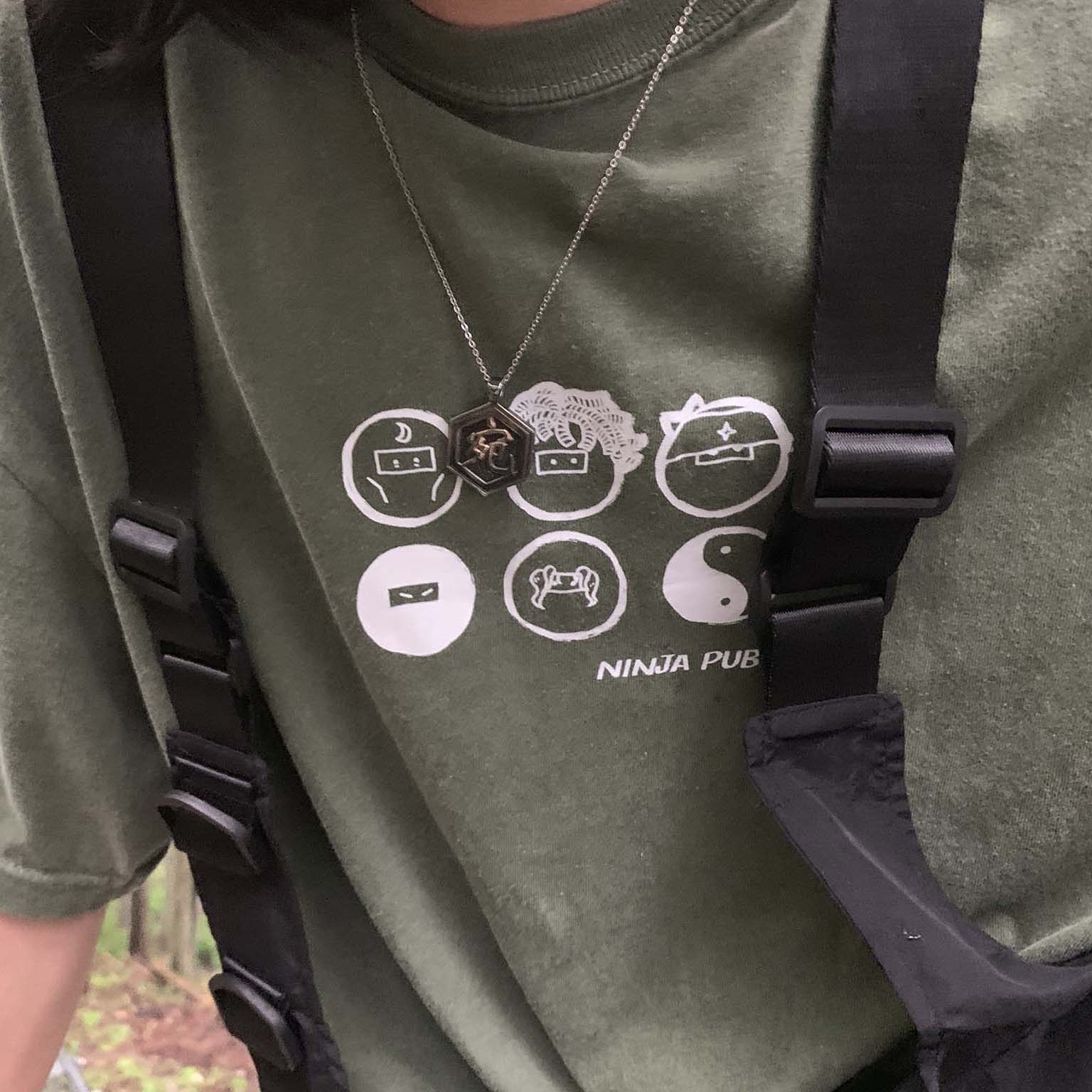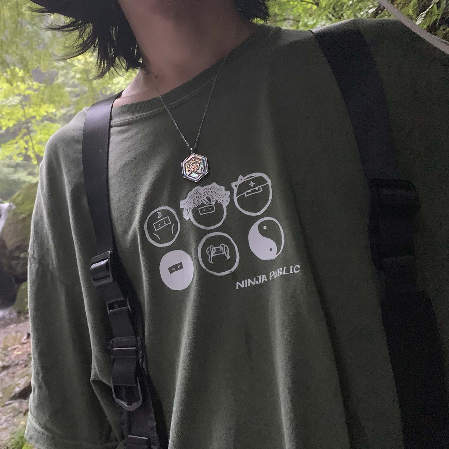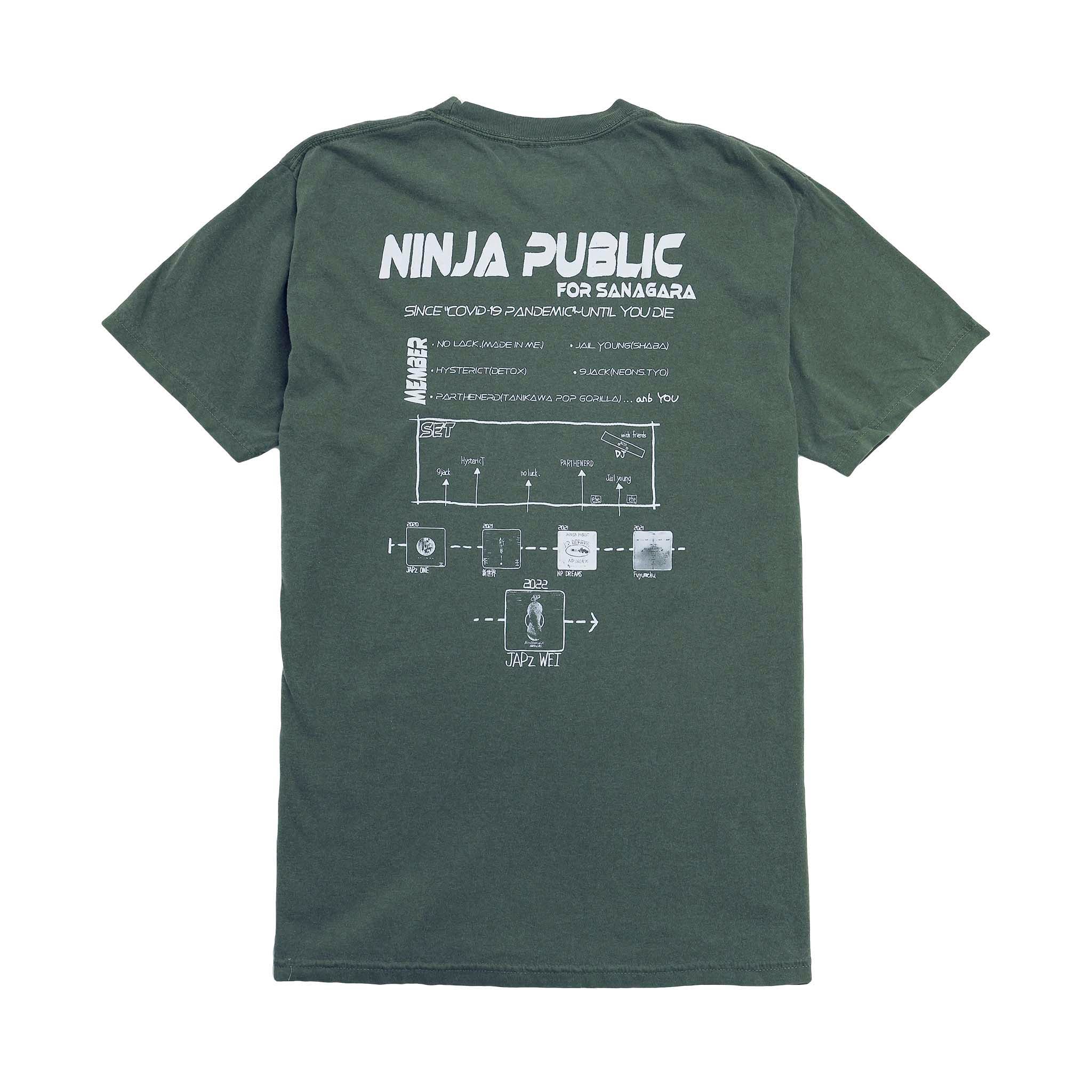 遂にリリース! NINJA PUBLICの公式良品Tee。メンバーを忍者にデフォルメした表のデザインは、5MCのメンバーに加えて陰陽太極図を施しました。陰陽はインヨウと読みローマ字に起こすと”IN YOU”となります。これを着るあなたは6人目のメンバーでもあり、「NINJA PUBLICはいつでもあなたの中(In you)に」というメッセージを込めて。背面のデザインはLIVEのセット図をそのままに、これまでのリリースの軌跡を纏めました。コロナ禍に始まり、命尽きるその日まで“I (a)N(d)YOU”の物語を紡ぎましょう。