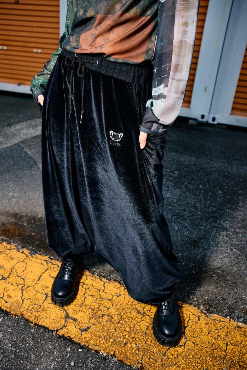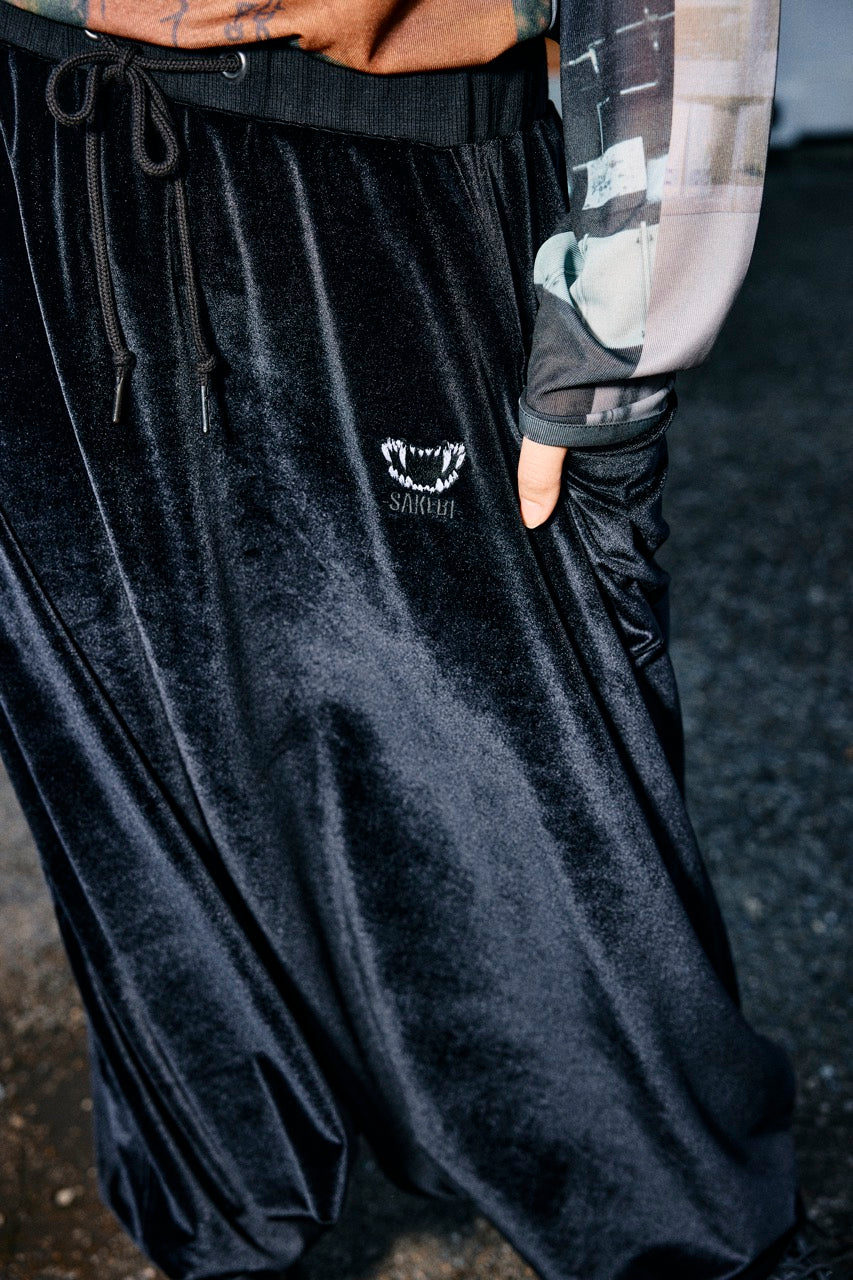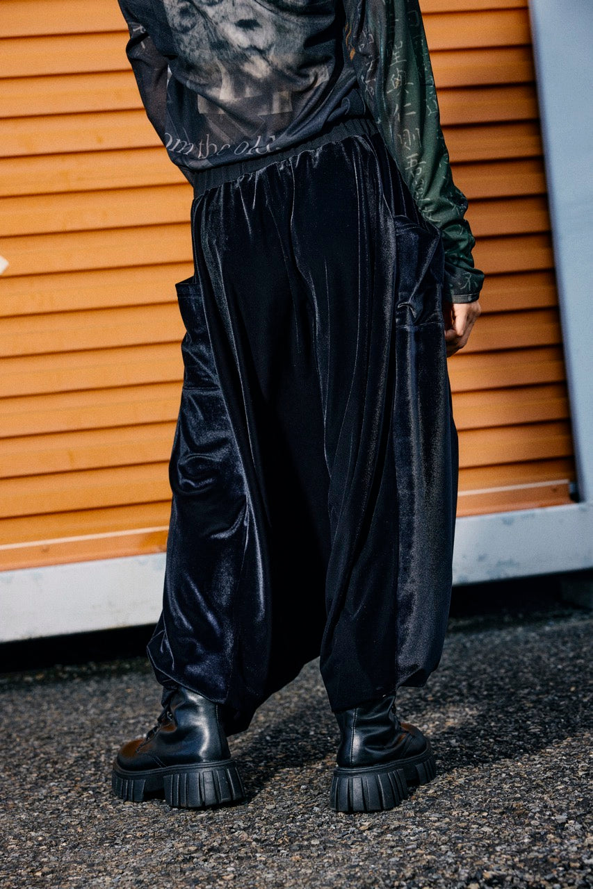 【SAKEBIおサル 2.0】2024年デザフェスvol.60にて販売した『おサル』から同じくベロアで少し生地の違うver.2.0がオンラインで新登場! 秋冬にも着れる存在感あるサルエルパンツを探していて、ベロア生地のサルエルパンツって無いな!?と思い、突然のアイディアから生まれました。大胆にベロア生地を使い、とても綺麗な光沢があります。深めのポケットと左側には叫美の刺繍が入っています。黒い素材に黒刺繍なので、最低限の主張なのがまたいいと思います。