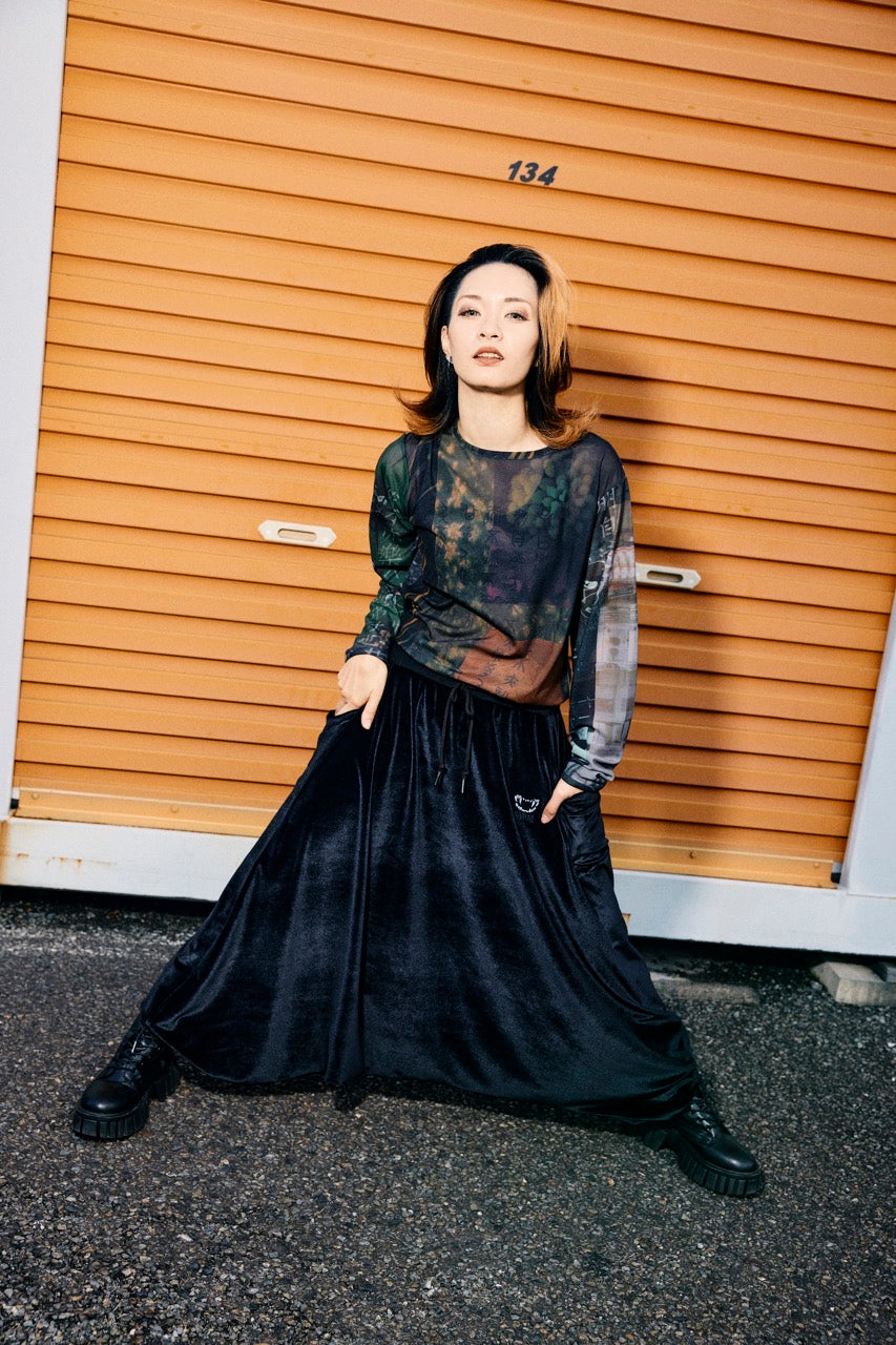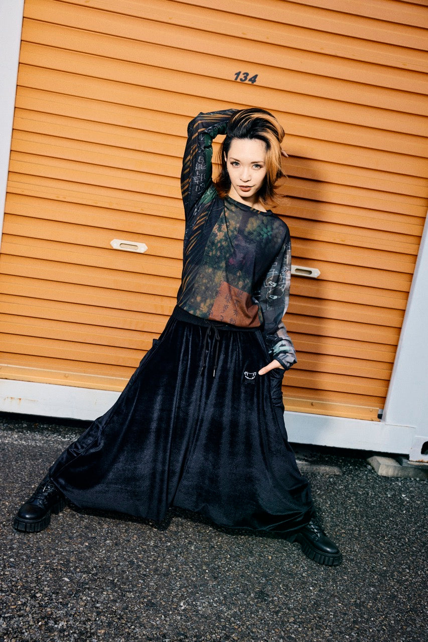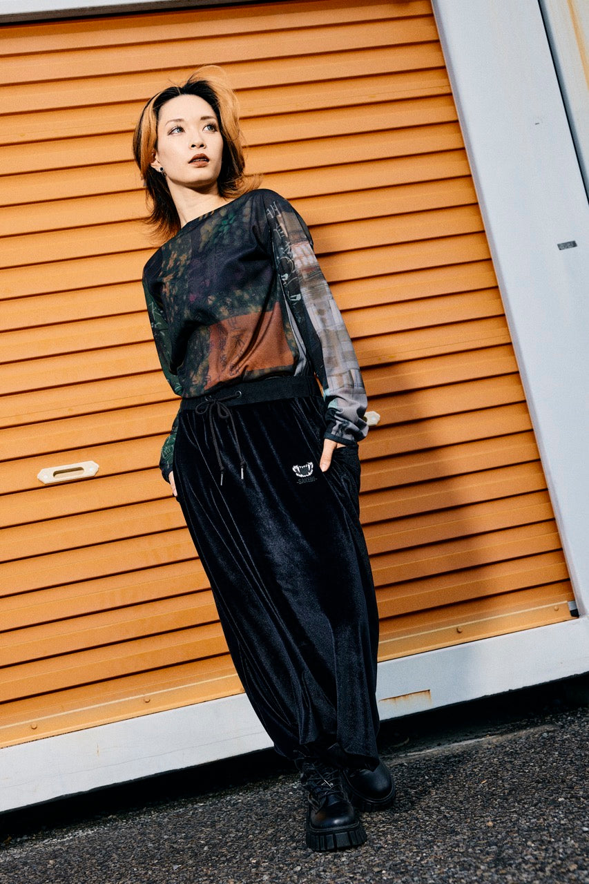 【SAKEBIおサル 2.0】2024年デザフェスvol.60にて販売した『おサル』から同じくベロアで少し生地の違うver.2.0がオンラインで新登場! 秋冬にも着れる存在感あるサルエルパンツを探していて、ベロア生地のサルエルパンツって無いな!?と思い、突然のアイディアから生まれました。大胆にベロア生地を使い、とても綺麗な光沢があります。深めのポケットと左側には叫美の刺繍が入っています。黒い素材に黒刺繍なので、最低限の主張なのがまたいいと思います。