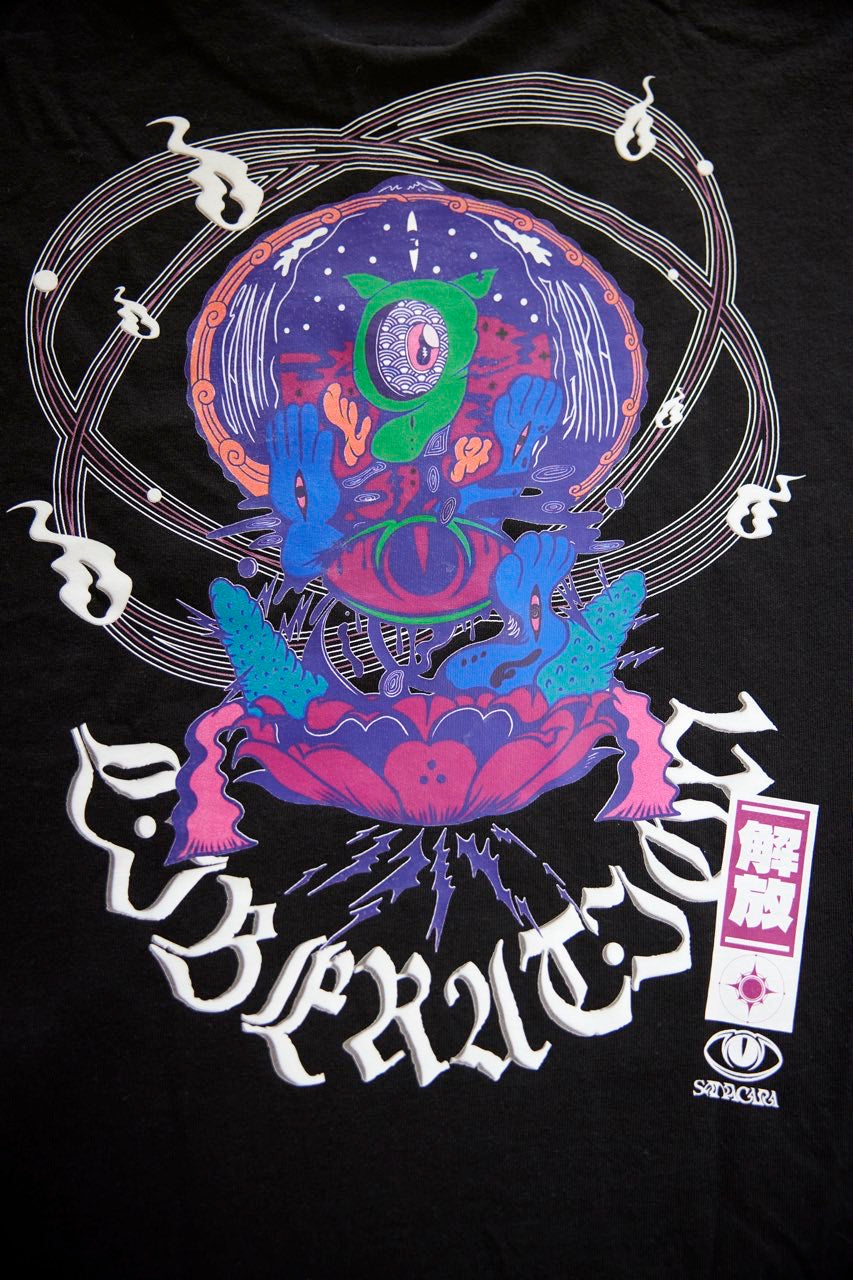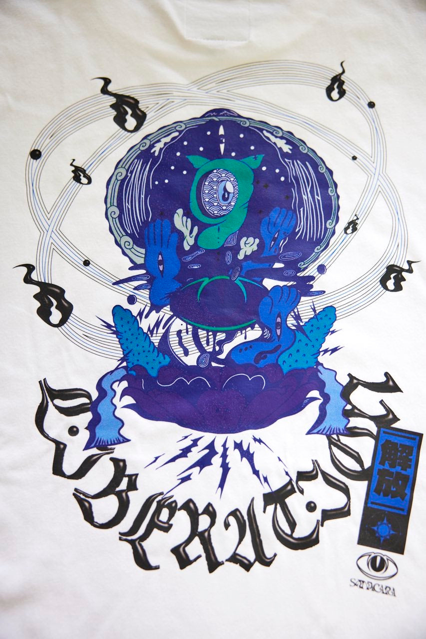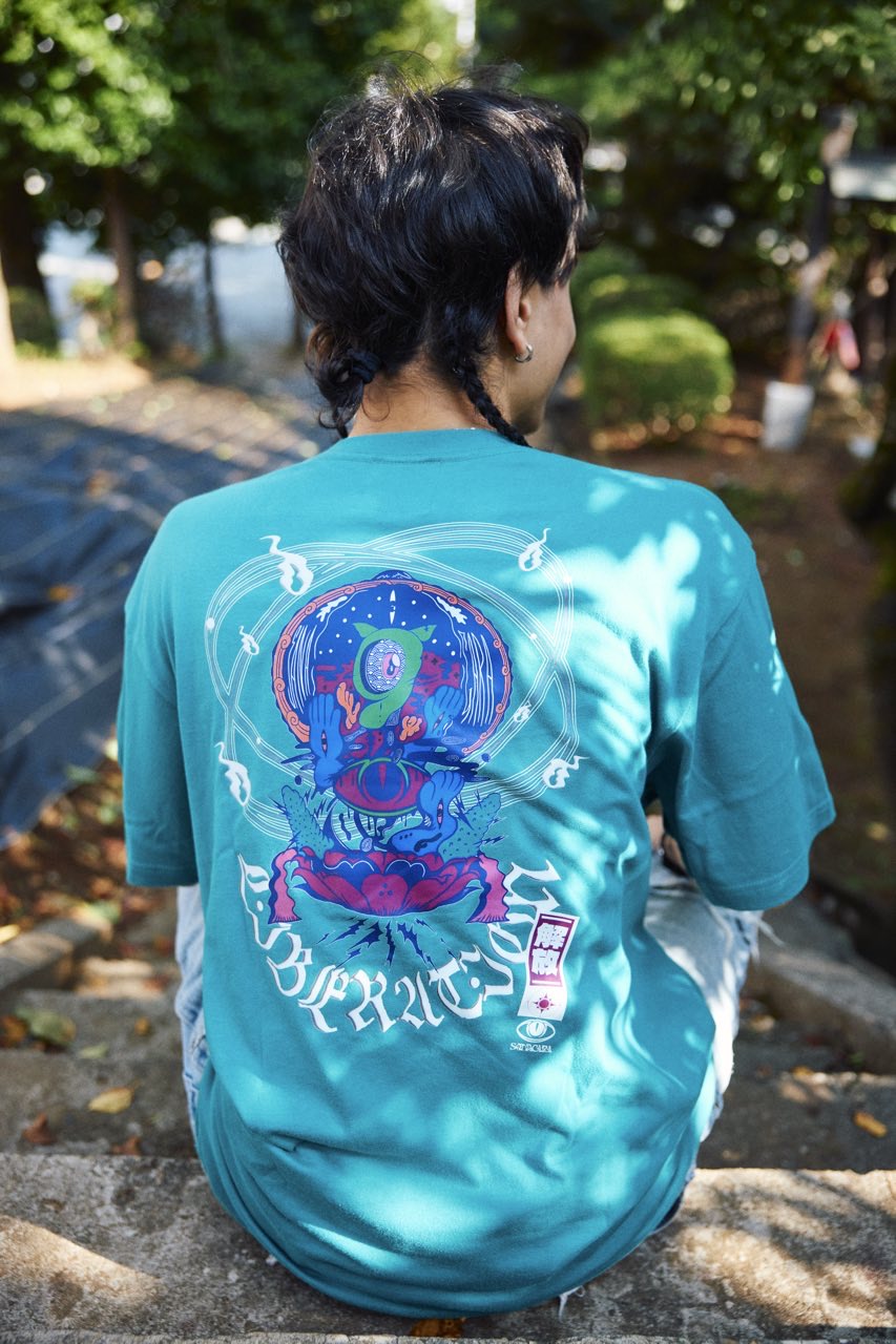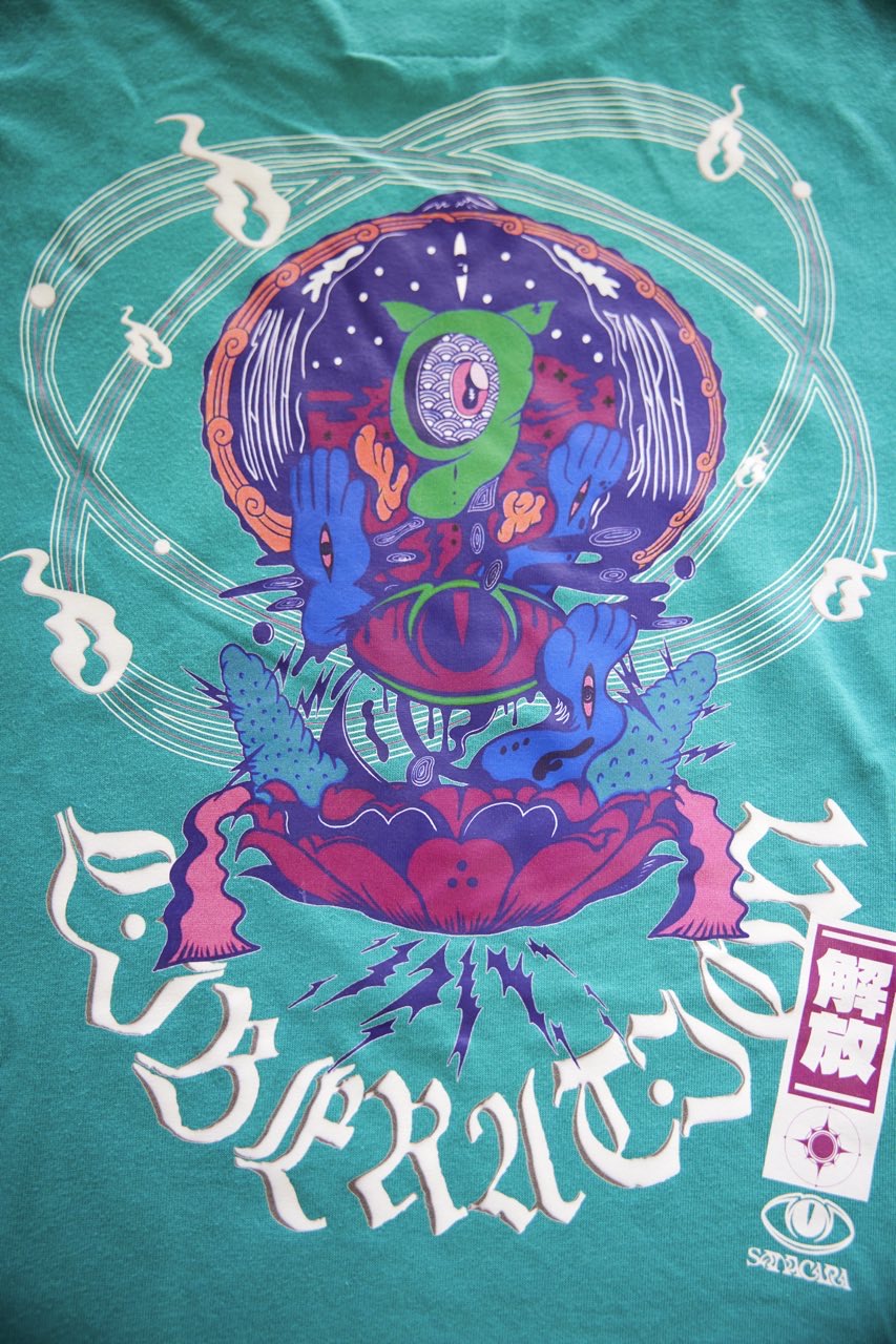 サイケデリックイラストレーター奴隷ちゃん(Slave-Chang)とSANAGARA APPARELコラボ商品が新登場!DETOX知弥の加筆によって完成した「Slave-liberation Tシャツ」は何の為に生まれて、何の為に生きるのかわからなくってしまった現代の迷える魂を解放するべく製作されました。SANAGARA APPAREL NEWロゴの目のモチーフとなった「むにむさん」を奴隷ちゃんテイストで描き上げ、輪廻転生する魂達を知弥が装飾しました。死者の魂が還る日本の夏の日、道標としてご武装ください。