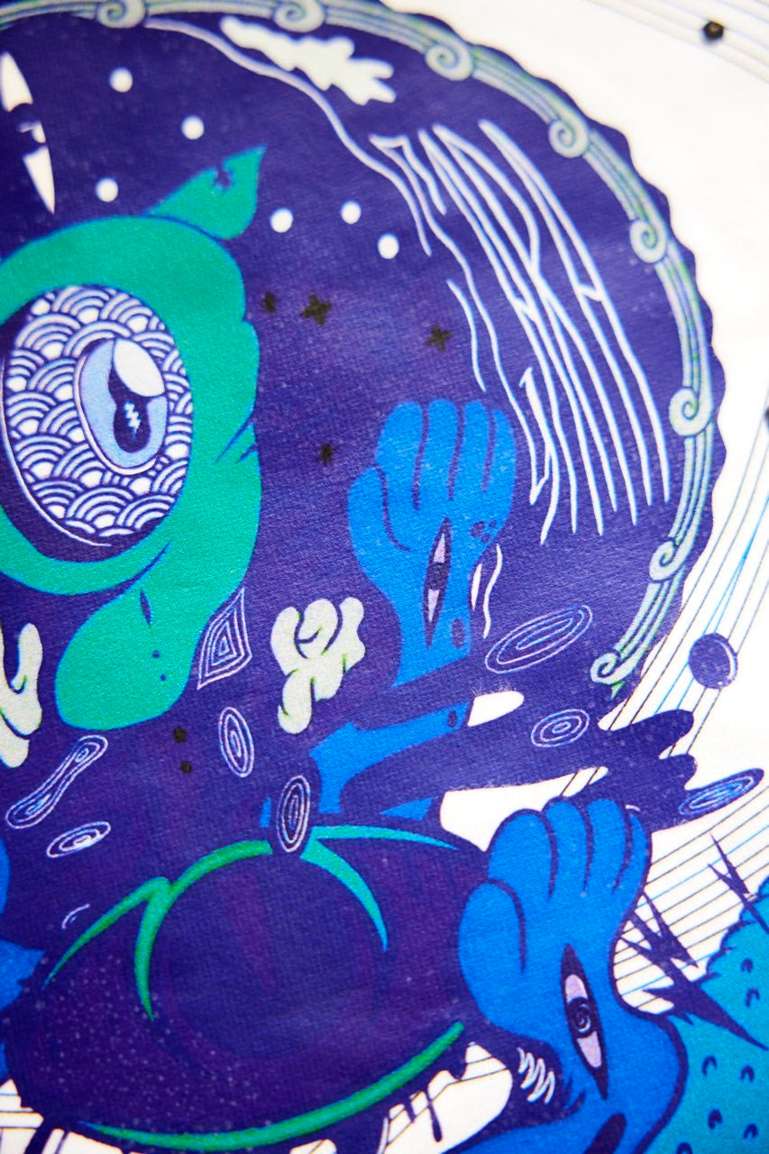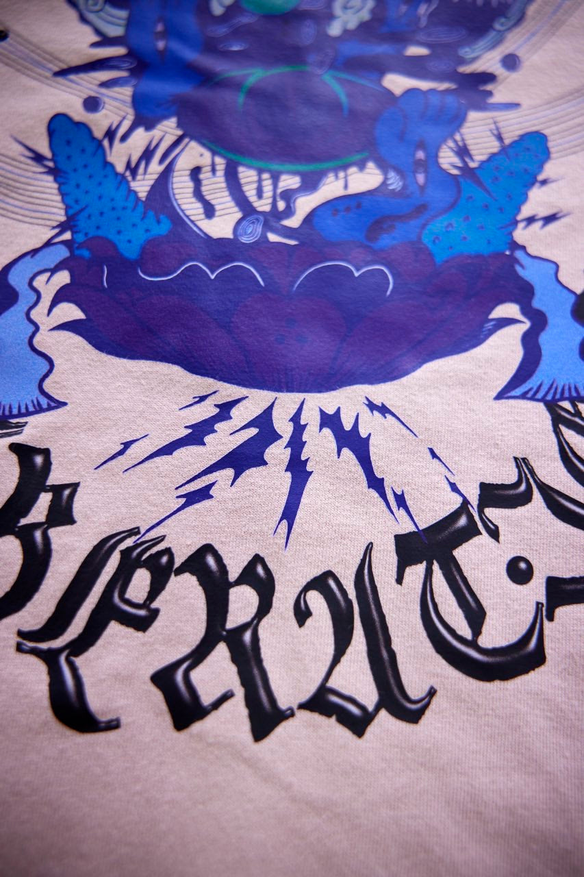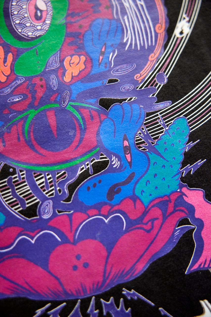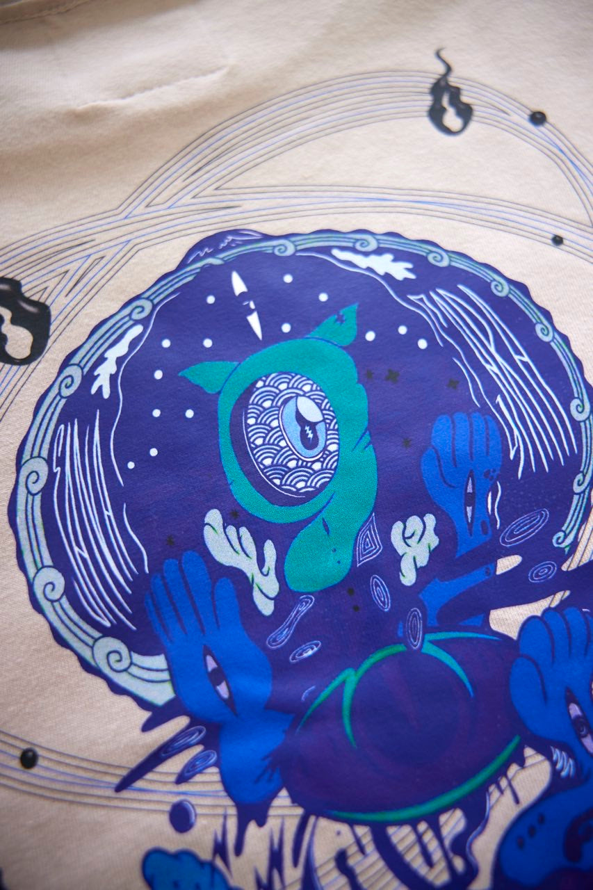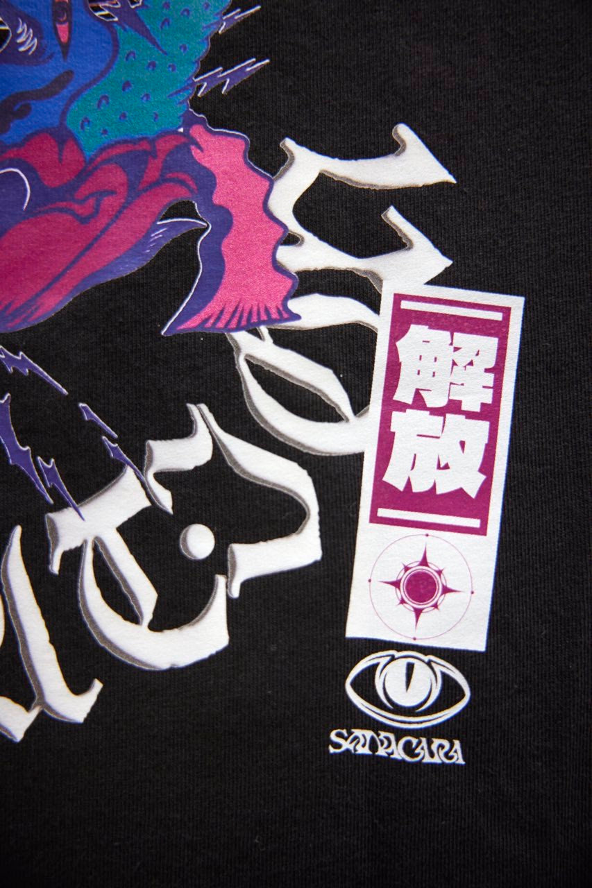 サイケデリックイラストレーター奴隷ちゃん(Slave-Chang)とSANAGARA APPARELコラボ商品が新登場!DETOX知弥の加筆によって完成した「Slave-liberation Tシャツ」は何の為に生まれて、何の為に生きるのかわからなくってしまった現代の迷える魂を解放するべく製作されました。SANAGARA APPAREL NEWロゴの目のモチーフとなった「むにむさん」を奴隷ちゃんテイストで描き上げ、輪廻転生する魂達を知弥が装飾しました。死者の魂が還る日本の夏の日、道標としてご武装ください。