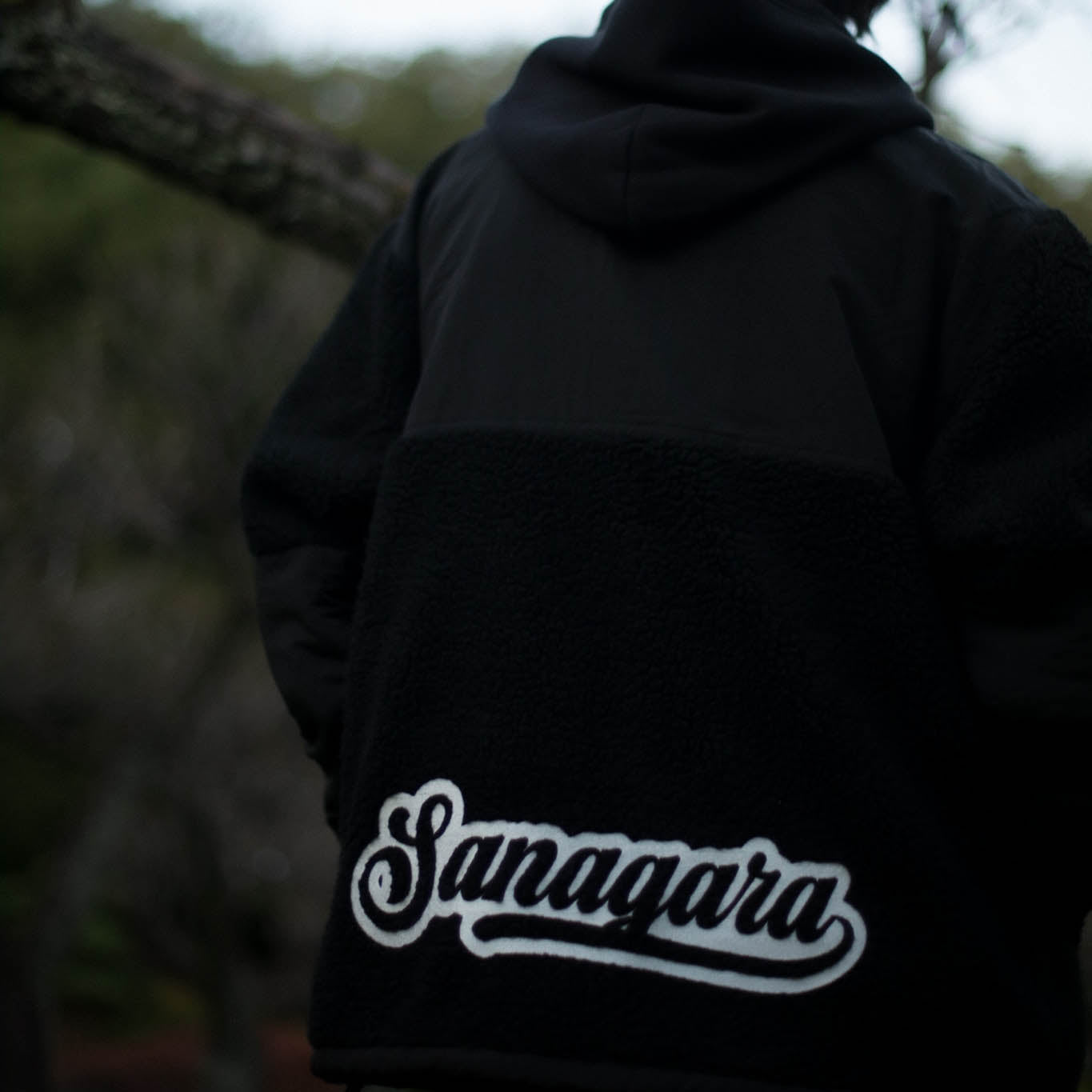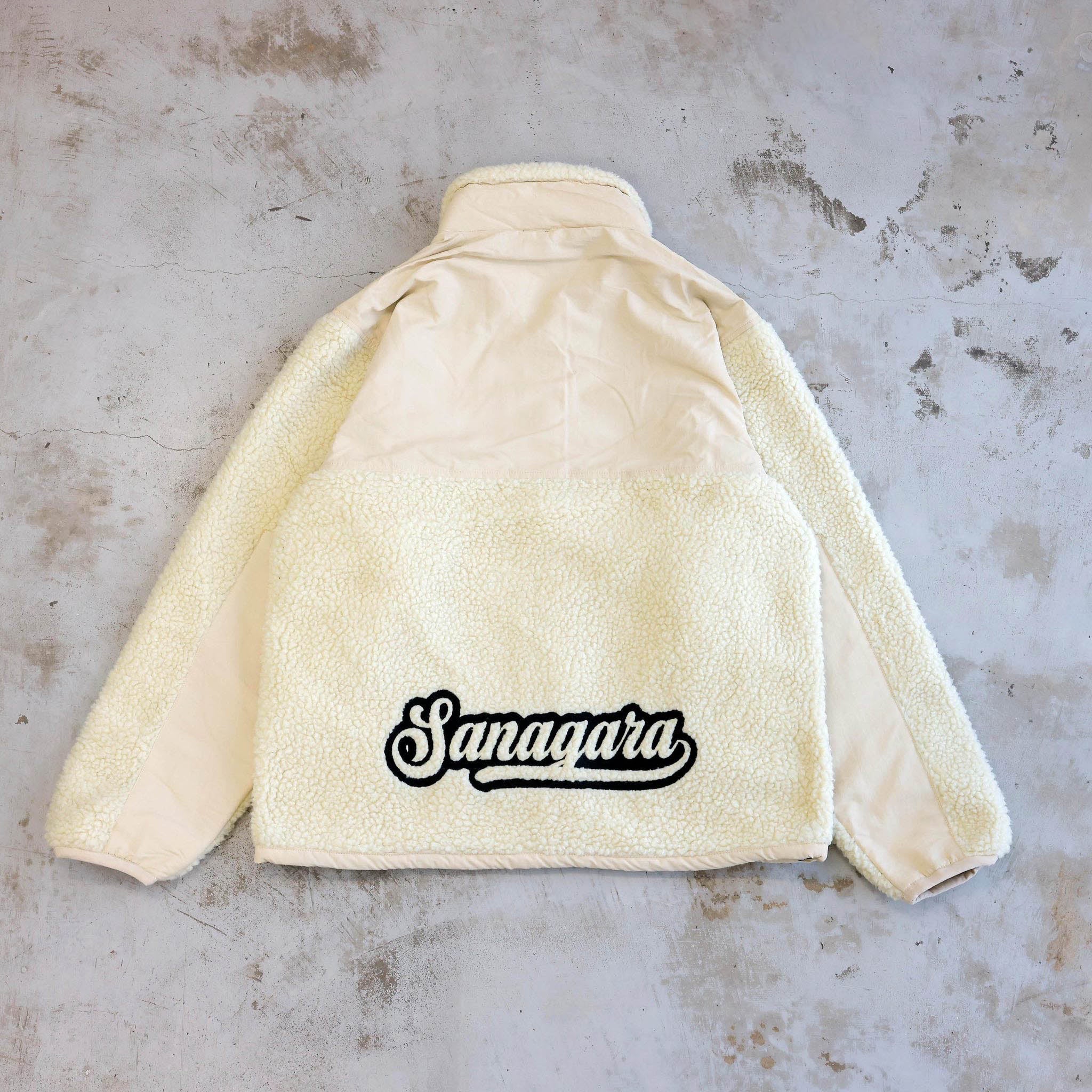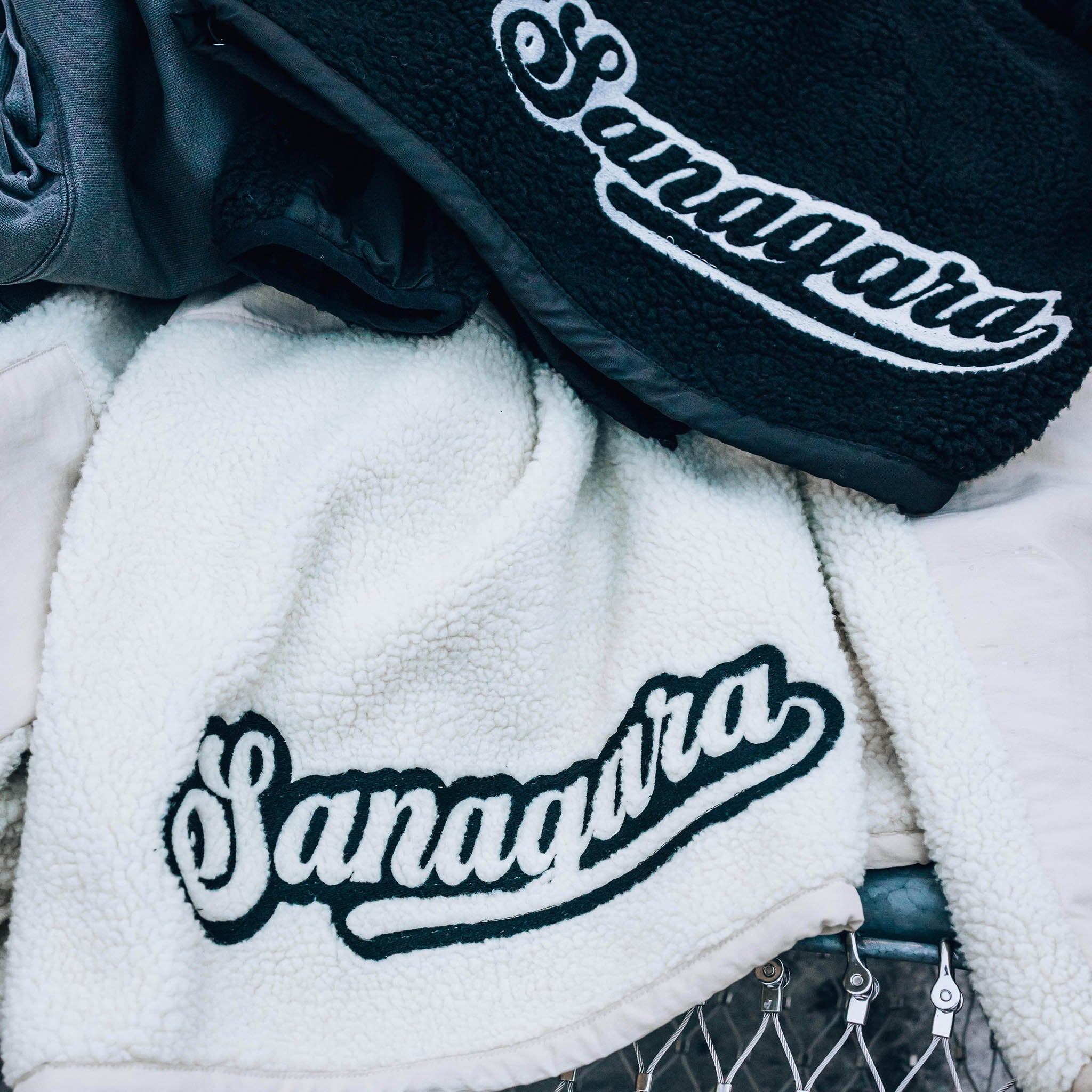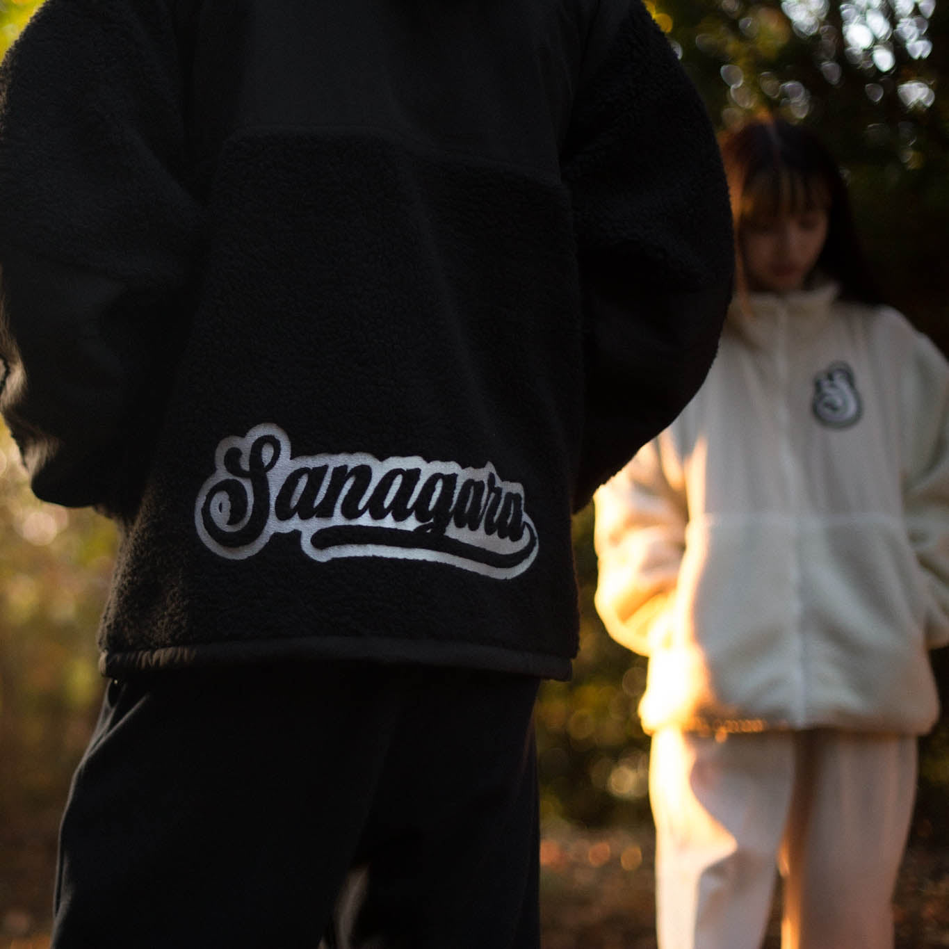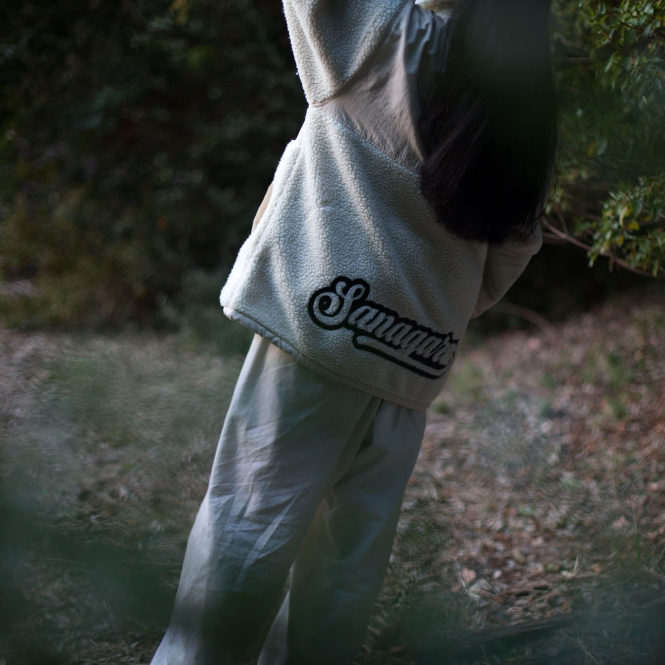 胸元にはサガラ刺繍のワンポイント。煖の為にRyoheyによって書き下ろされた新しいSANAGARA LOGOを背面にも大きく刺繍を施しました。文字の部分が浮き出るようにシープボアを利用した加工も要チェック! 冬の寒さに対抗するべく煖をとりましょう。あったかいんだから。ブラックとナチュラルの二色展開。この冬マストアイテムです。