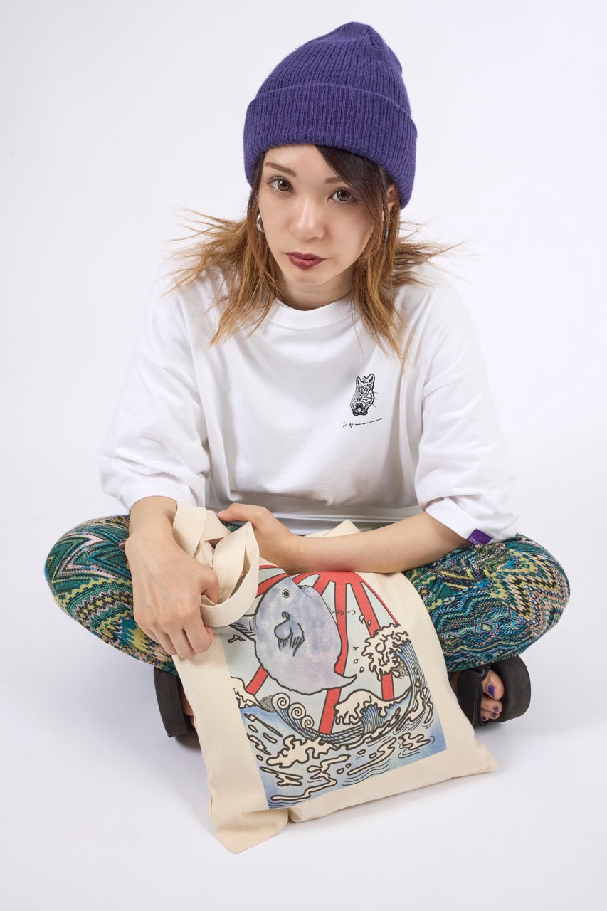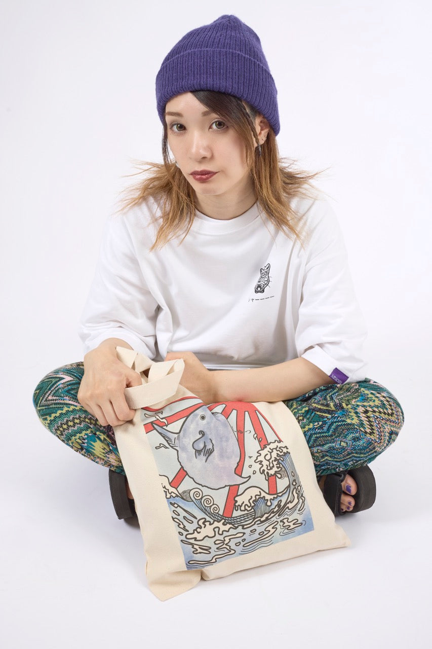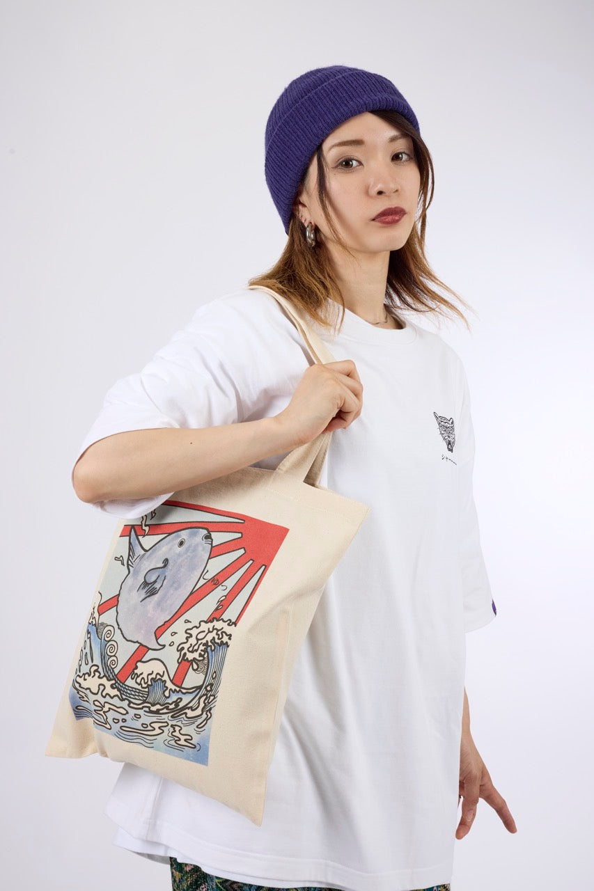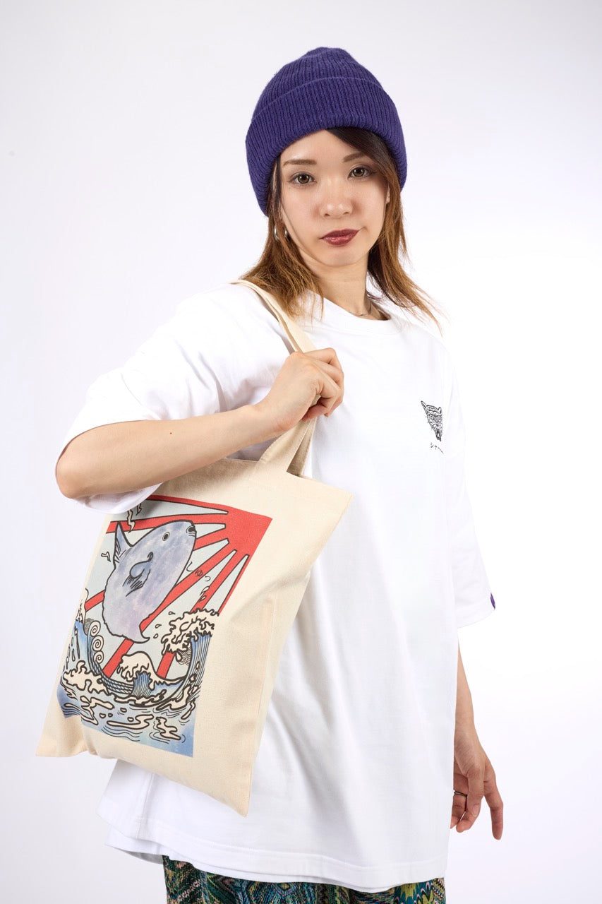 2024年2月、初となる武道館公演を終えた地獄のゆるふわバンド「NEMOPHILA」のvo.mayuとSANAGARA APPARELの初コラボトートバッグ。誤解を受けながらも健気に生きるマンボウが好きだというmayuさん。mayuさんが描き下ろした跳ねるマンボウのイラストをトートバッグに。海と日章旗のようなラインが入った和テイストなイラスト。テスカトリポカのタトゥーアートの様なタッチに跳ねマンボウのイラストと、振り幅あるデザインを自身で描き上げるmayuさんの絵の才能が光る逸品。マチのないライトなトートバッグ。小物使いにピッタリです。