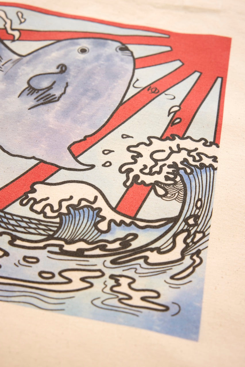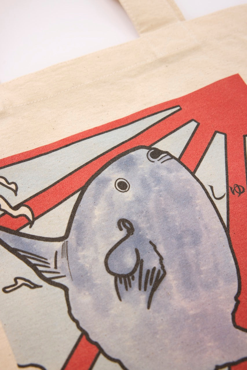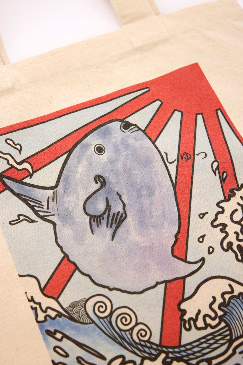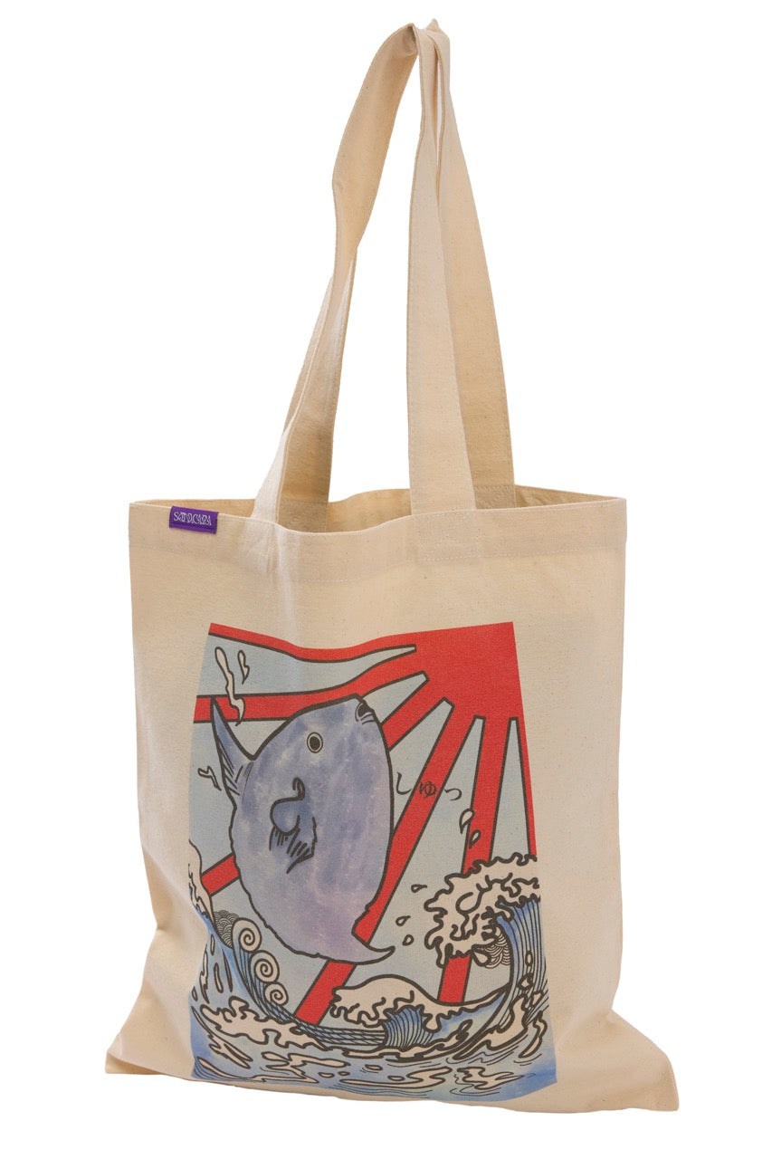2024年2月、初となる武道館公演を終えた地獄のゆるふわバンド「NEMOPHILA」のvo.mayuとSANAGARA APPARELの初コラボトートバッグ。誤解を受けながらも健気に生きるマンボウが好きだというmayuさん。mayuさんが描き下ろした跳ねるマンボウのイラストをトートバッグに。海と日章旗のようなラインが入った和テイストなイラスト。テスカトリポカのタトゥーアートの様なタッチに跳ねマンボウのイラストと、振り幅あるデザインを自身で描き上げるmayuさんの絵の才能が光る逸品。マチのないライトなトートバッグ。小物使いにピッタリです。