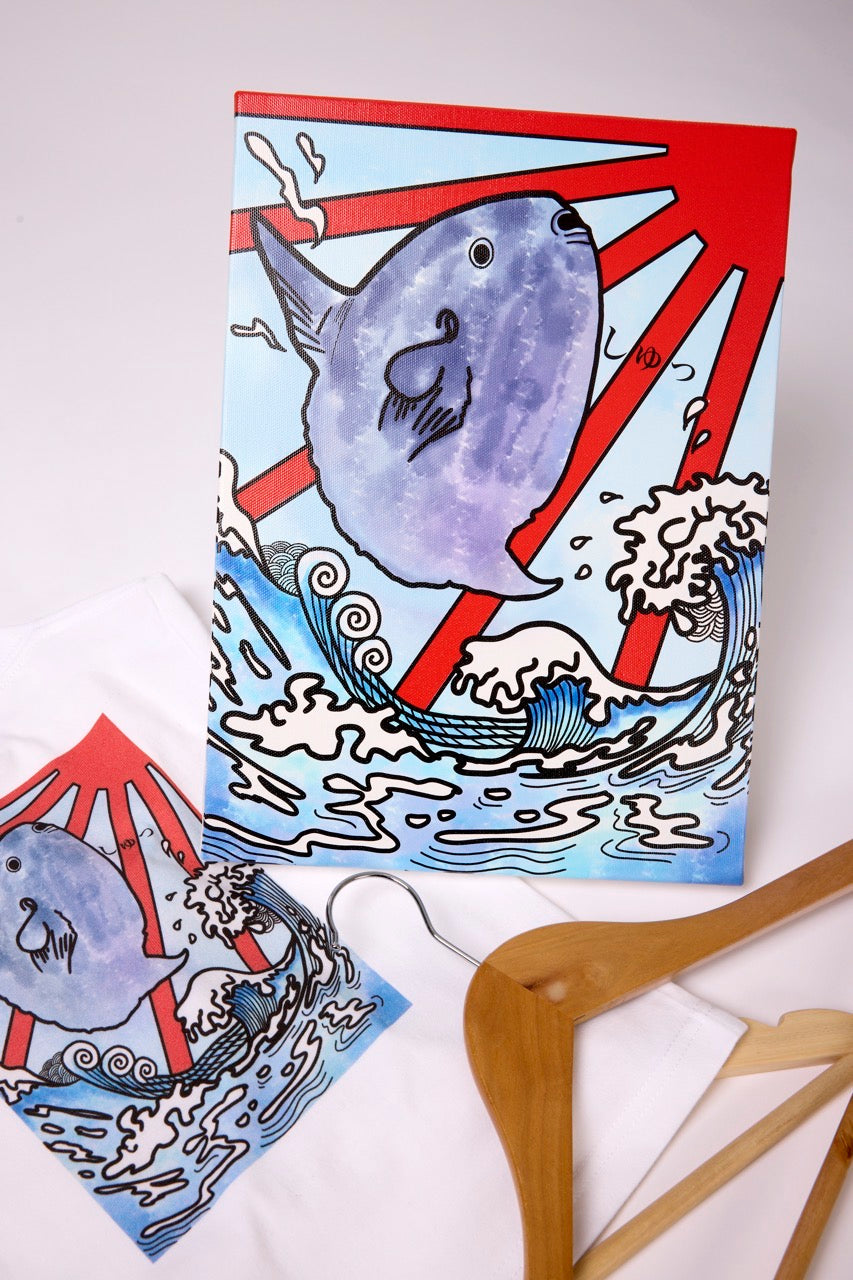 Artist Canvasが新登場! F4サイズ(333×242mm)のキャンバスにmayuさんが描き上げた跳ねマンボウをプリント。この世に6枚しか存在しないキャンバスですが、1枚はmayuさん所有、残り5枚が販売用となっています。mayuさん直筆サインとシリアルナンバーが入った限定生産商品になります。実際にキャンバスにプリントされたイラストはすごくエネルギーを感じる素敵なARTになっています。マンボウが好きな方、マンボウのように跳ね上がりたい方。ぜひご自宅や会社の一角にお飾りください。