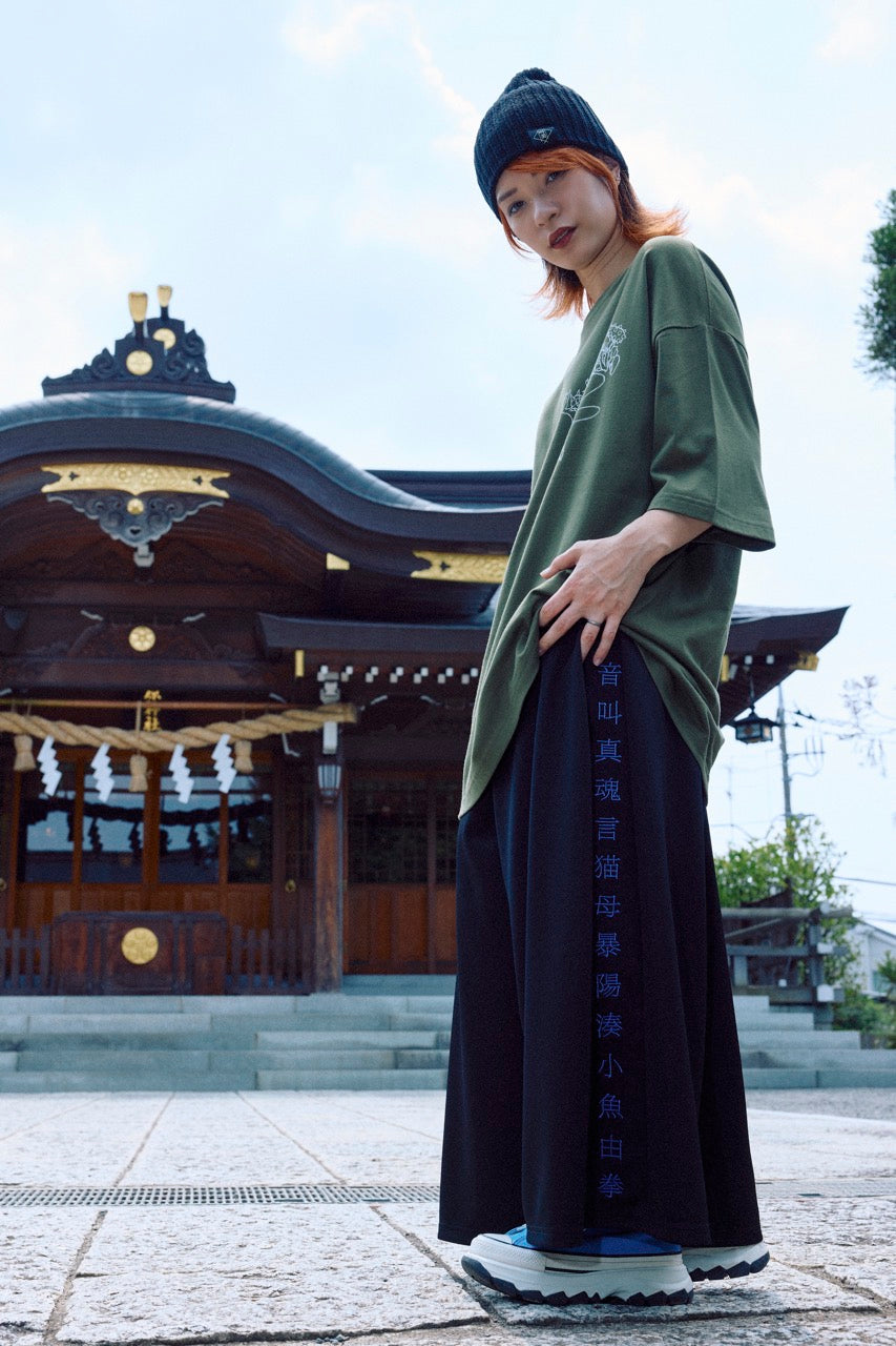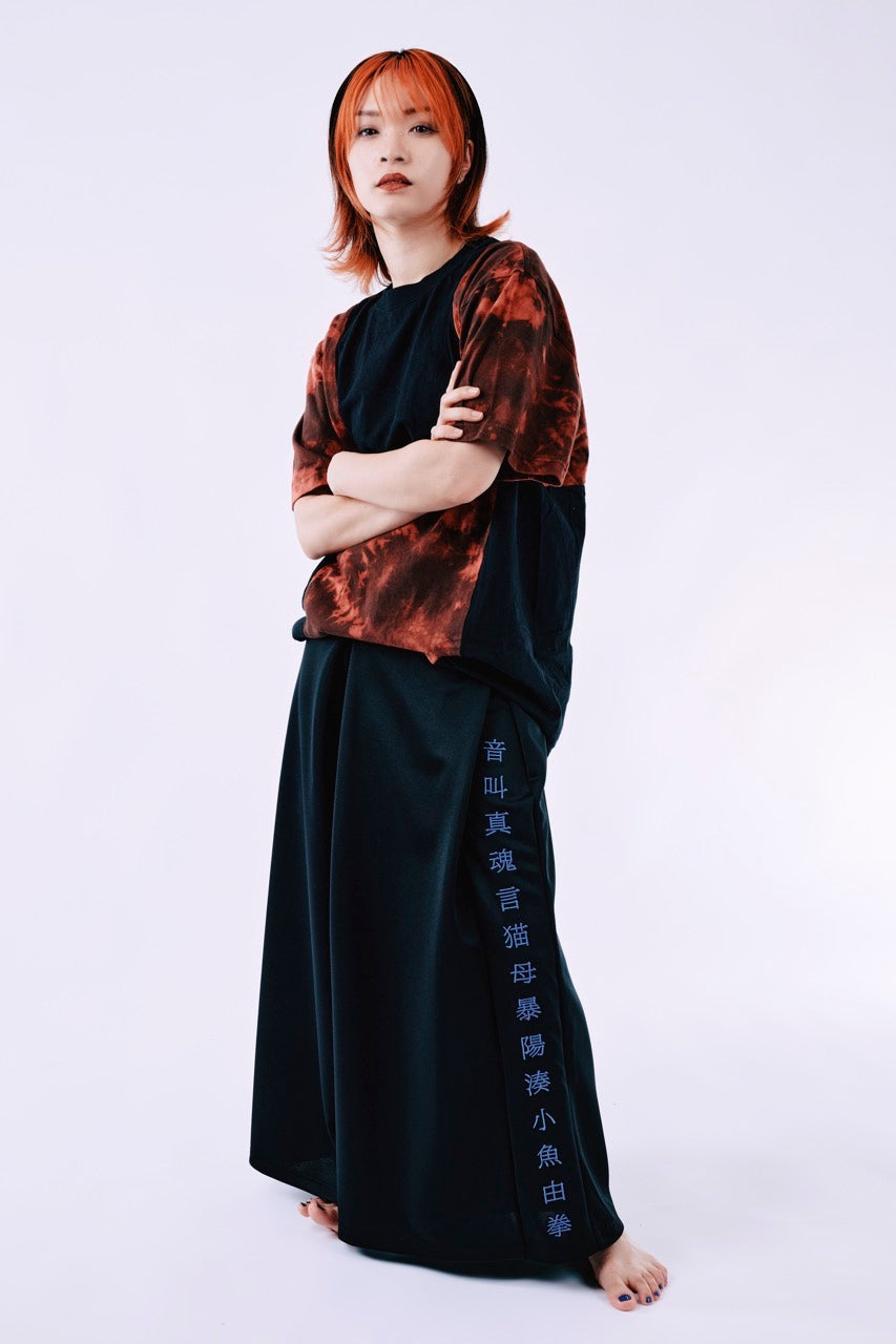 SANAGARAとコラボさせてもらうにあたって、niituさんの袴ジャージの型がめちゃめちゃ好きでやらせてほしい! と始まりました。 側面の漢字は私の好きな漢字を並べていきました。私を連想する言葉や好きなものを順番も何も関係なく思いつくままに並べました。 この漢字はこの事かな? と連想して遊んでみて欲しいです!