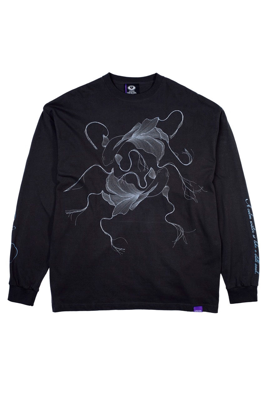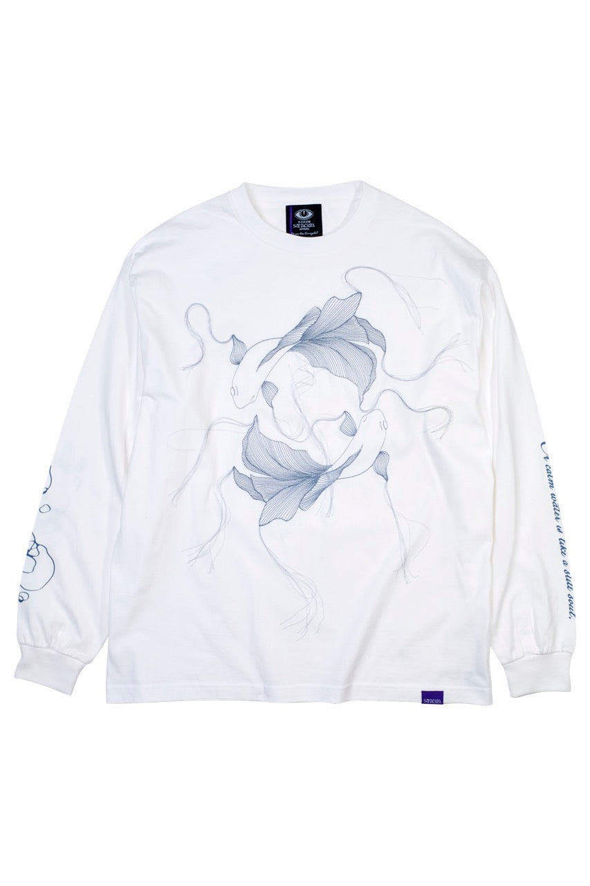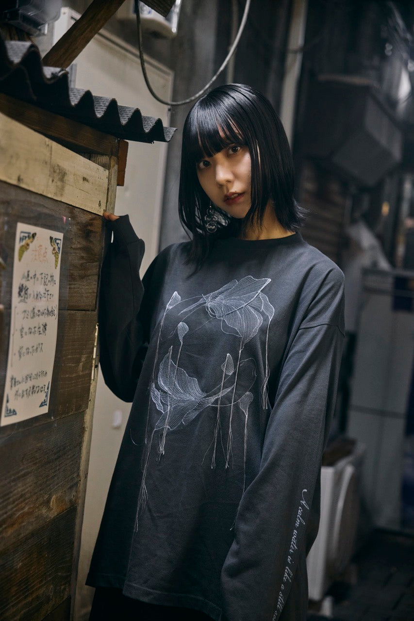 デザフェスで開催された「LOVE AND PSYCHEDELIC Vol.03」に出演の、りさと月丘が生み出した限定コラボアイテム。りさのアイデアを元に月丘がデザイン。“魂の片割れ” を意味する「ツインレイ」という言葉を、2匹の魚のモチーフとして描きました。りさが愛する水中世界を鮮やかに表現し、全面刺繍が施されたデザインは、繊細で独特な美しさを纏っています。刺繍の端が垂れるディテールは、まるで水中で揺れる光のよう。細部にまで宿るこだわりが特別な1着を彩ります。限定枚数のオンライン販売、この機会をお見逃しなく。